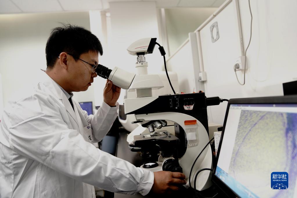 11月16日,中國科學(xué)院分子植物科學(xué)卓越創(chuàng)新中心博士后黃永財(cái)用顯微鏡觀察玉米胚乳細(xì)胞。