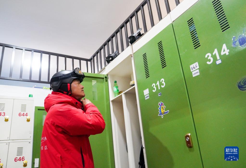 張占華在吉林市萬科松花湖度假區(qū)更換滑雪裝備(11月20日攝)。38歲的張占華是吉林市永吉縣北大湖鎮(zhèn)官地村村民。2016年開始,他利用冬天農(nóng)閑時(shí)間來到吉林市萬科松花湖度假區(qū)做滑雪教練。