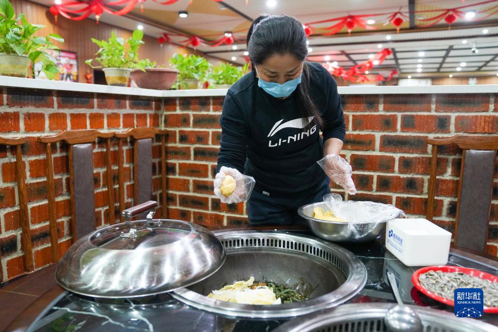 于淑芬為在自己經(jīng)營(yíng)的農(nóng)家樂里為客人準(zhǔn)備鐵鍋燉食材(11月21日攝)。在吉林市永吉縣北大湖鎮(zhèn)南溝村,53歲的村民于淑芬經(jīng)營(yíng)農(nóng)家樂已有12年。目前,吉林市冰雪試驗(yàn)區(qū)北大湖滑雪度假區(qū)旁的南溝村有餐廳、 旅店100余家,民宿床位1700余張,帶動(dòng)當(dāng)?shù)卮迕裨鍪铡?/div>