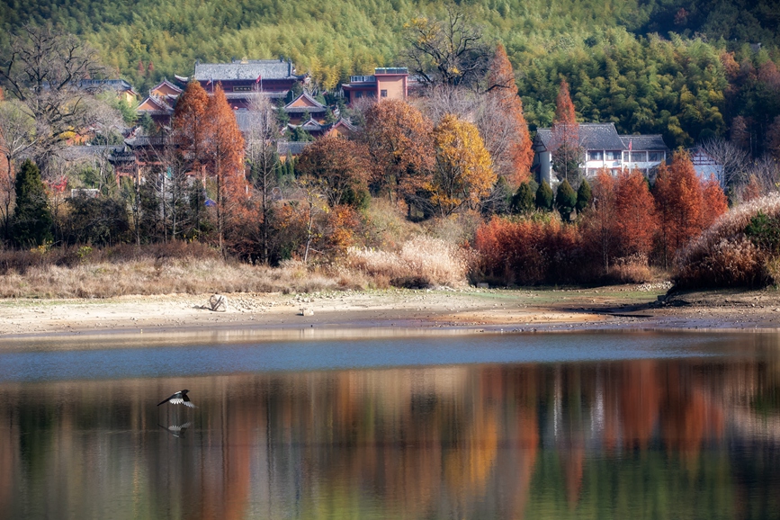 走進黃柏山,近處湖水澄澈如碧,蘆葦繞岸,銀杏成林;遠望,祥云飄浮,仙霧彌漫,林海蒼茫,古寺新村若隱若現(xiàn)。目之所及,映入眼簾的是一幅幅秀美畫卷,令人陶醉其中,流連忘返。