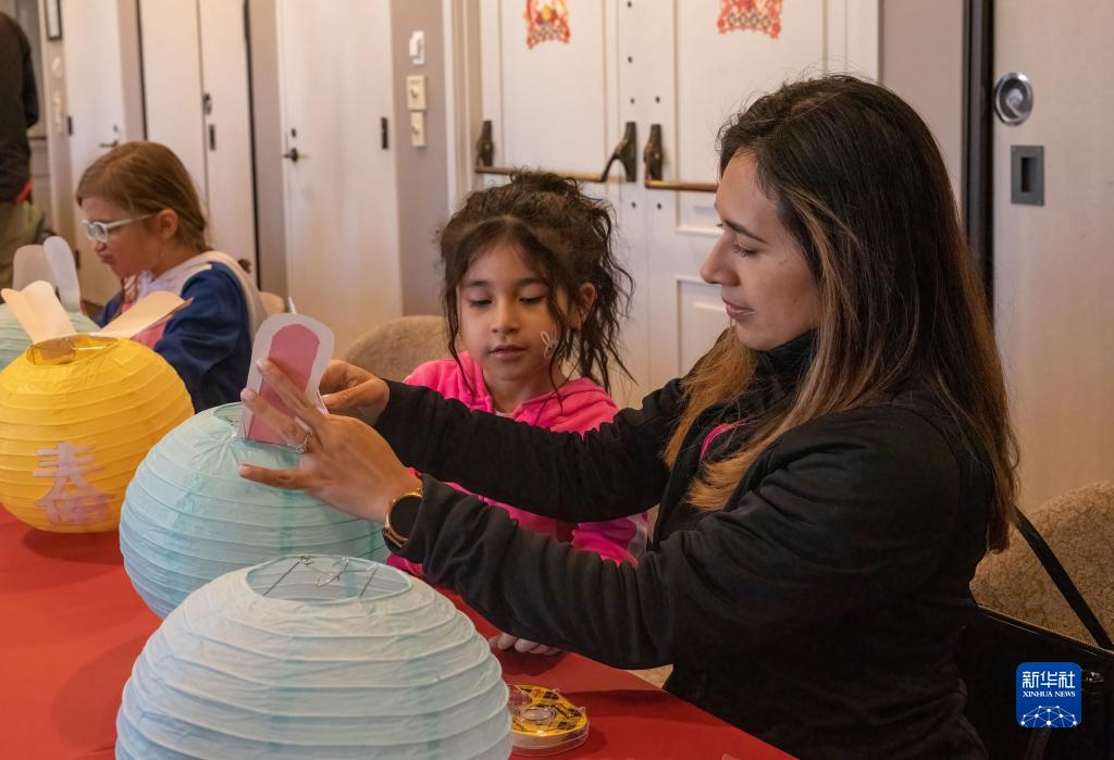 2月4日,在美國(guó)得克薩斯州紹斯萊克市的元宵節(jié)慶祝活動(dòng)上,人們體驗(yàn)制作燈籠。