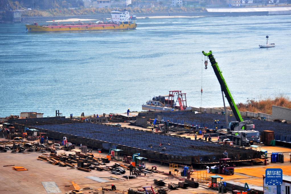 2月14日,湖北省宜昌市夷陵區(qū)樂天溪造船基地工人在加工制造大型貨船。