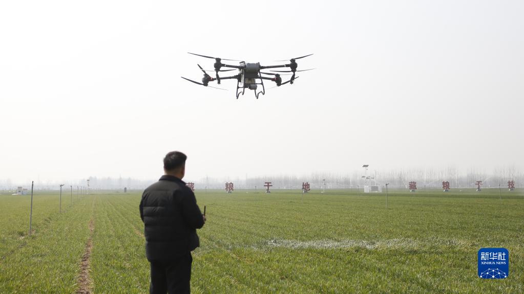 3月2日,河南省尉氏縣張市鎮(zhèn)農(nóng)民用植保無人機(jī)在田間為小麥噴灑葉面肥。