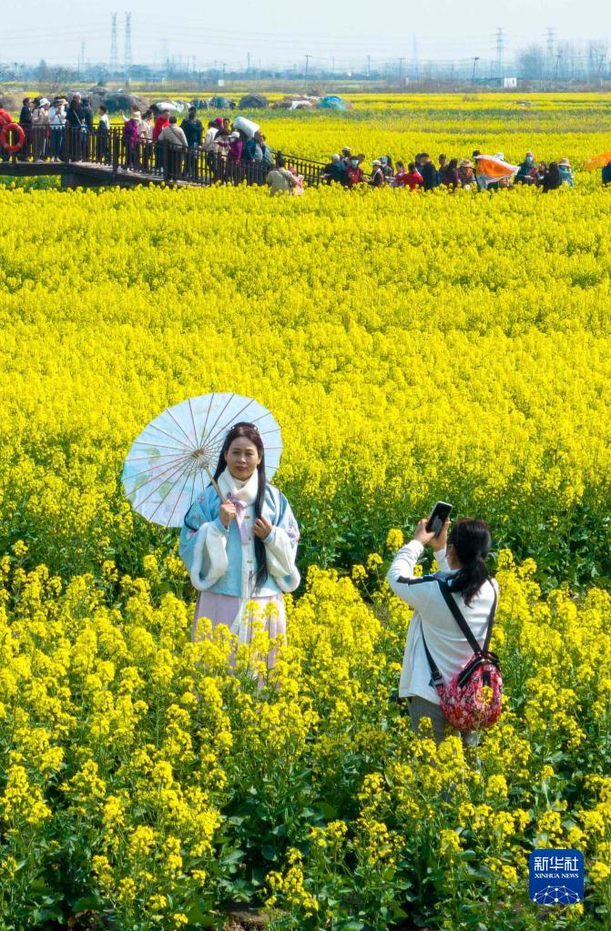 3月19日,游客在江蘇興化千垛菜花風(fēng)景區(qū)賞花拍照(無人機(jī)照片)。