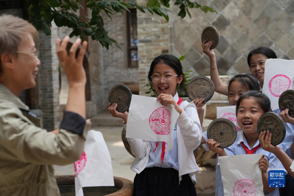 5月18日,小學(xué)生在河北省石家莊市新華區(qū)一家清代建筑博物館體驗(yàn)瓦當(dāng)拓片。