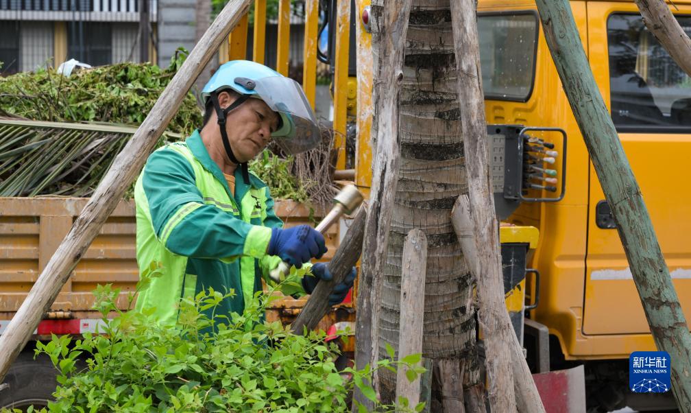 7月17日,在海口市新海大道,工作人員對樹木進行加固。