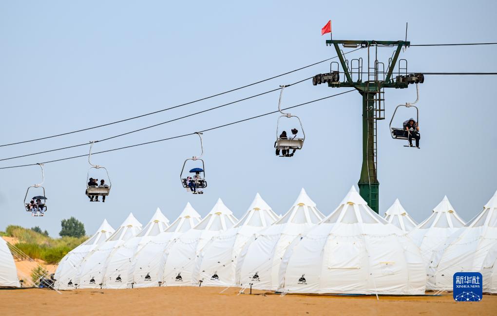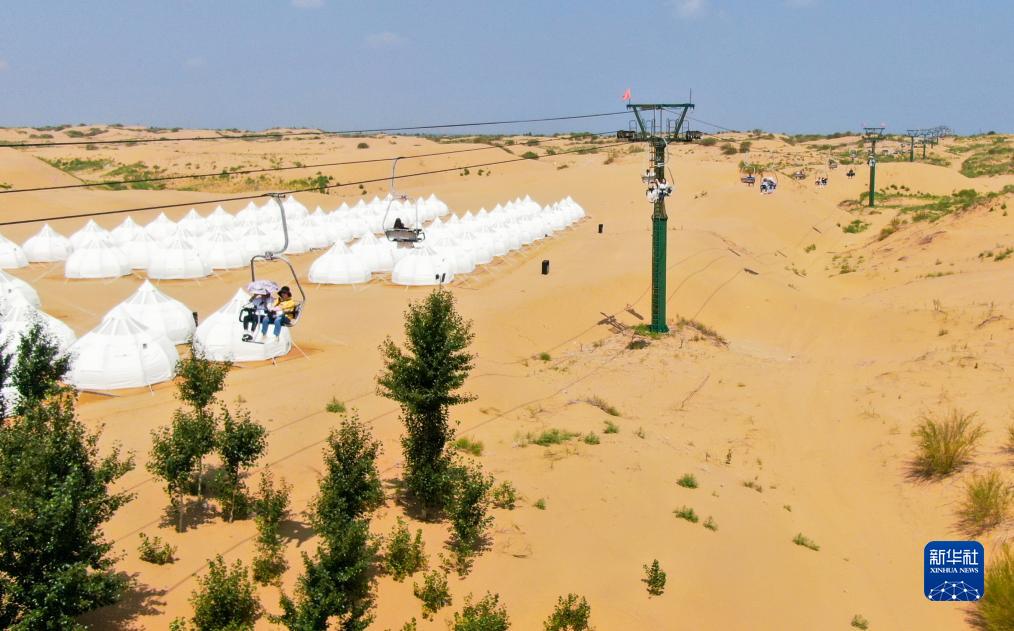 7月29日,游客在鄂爾多斯市達(dá)拉特旗境內(nèi)庫布其沙漠中的銀肯塔拉景區(qū)體驗(yàn)觀光纜車。