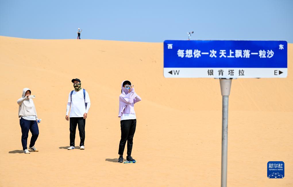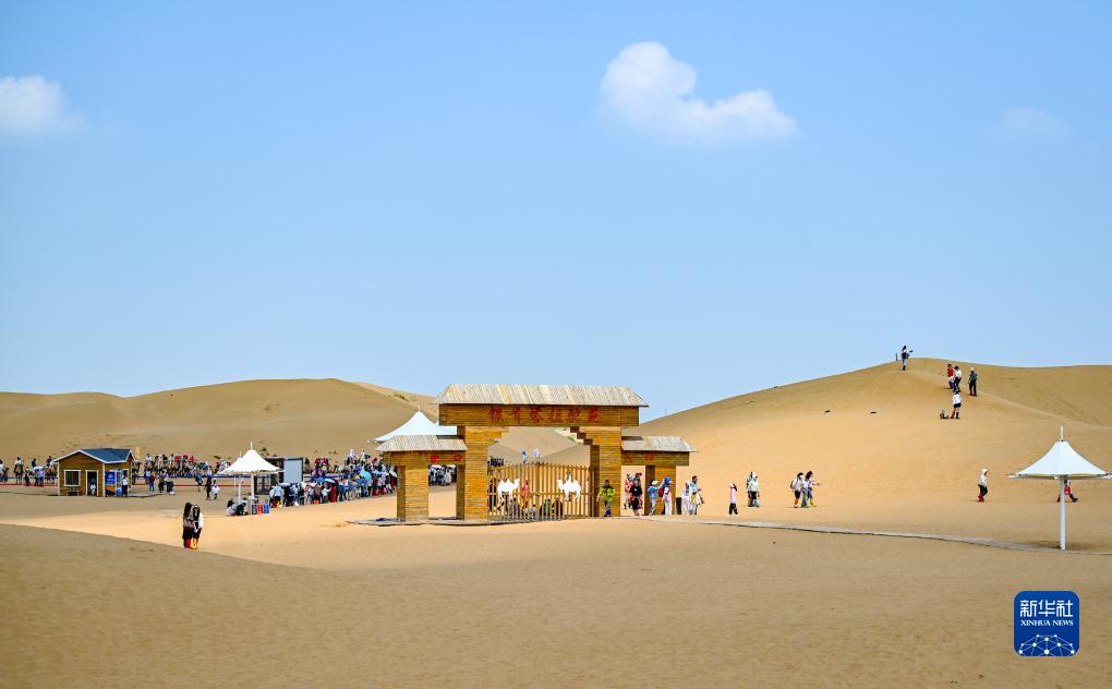 7月29日,游客在鄂爾多斯市達(dá)拉特旗境內(nèi)庫布其沙漠中的銀肯塔拉景區(qū)游玩。