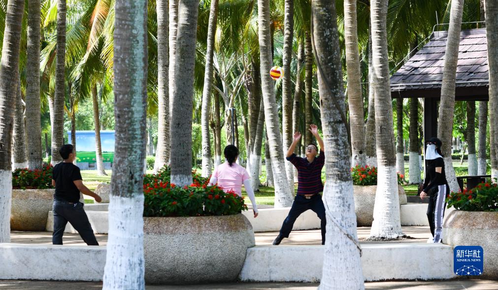 市民在海口市萬綠園內(nèi)打排球(2022年4月5日攝)。