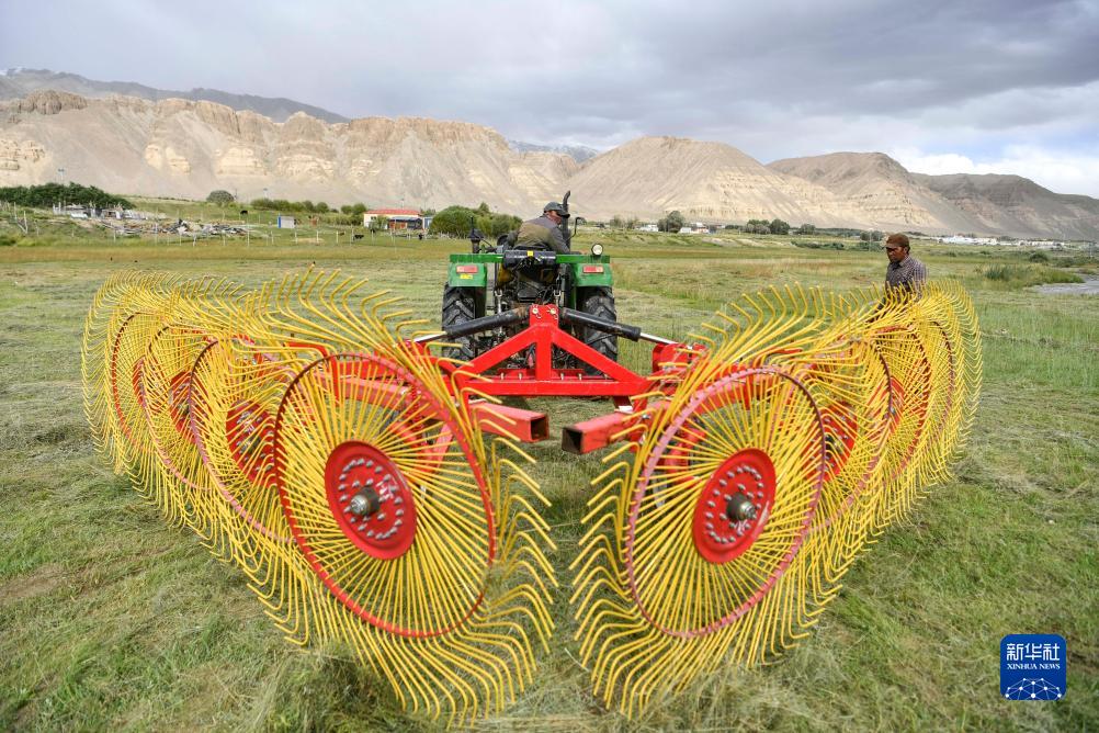 在新疆塔什庫爾干塔吉克自治縣瓦恰鄉(xiāng),牧民調試收割牧草的機械(8月28日攝)。