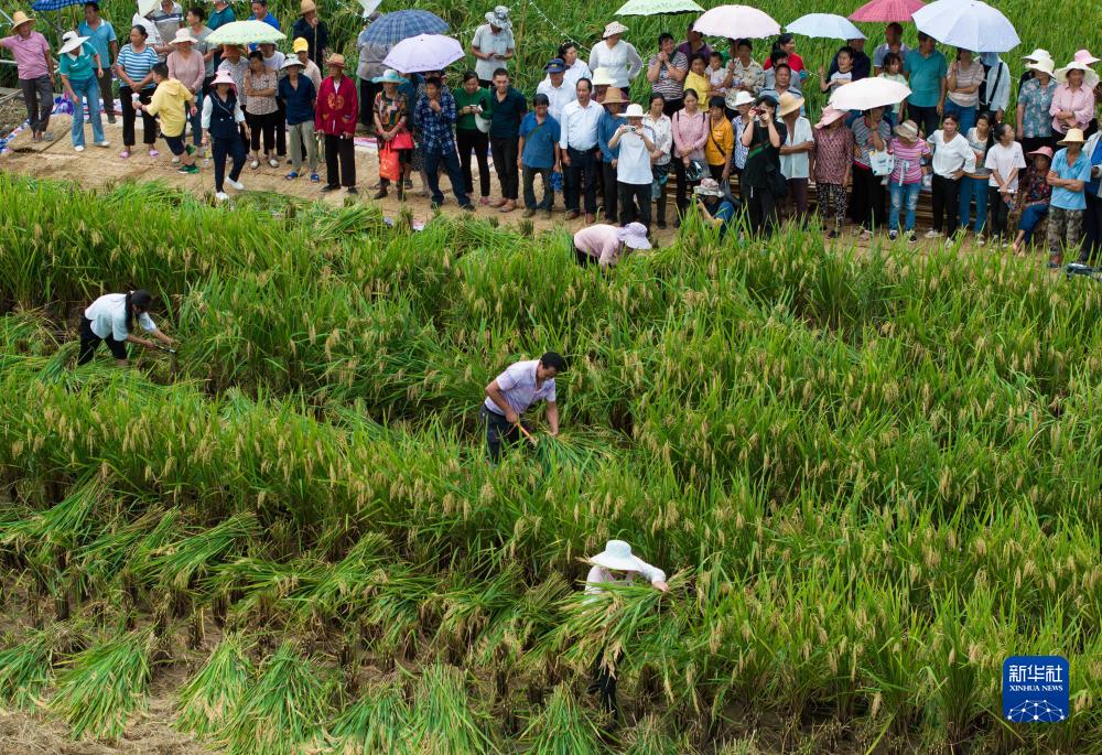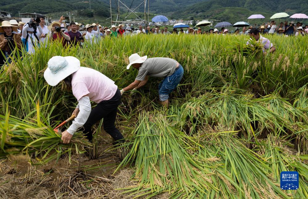 9月2日,在鹽邊縣惠民鎮(zhèn)興隆村的稻田里,來(lái)自惠民鎮(zhèn)的村民在參與稻谷收割比賽。