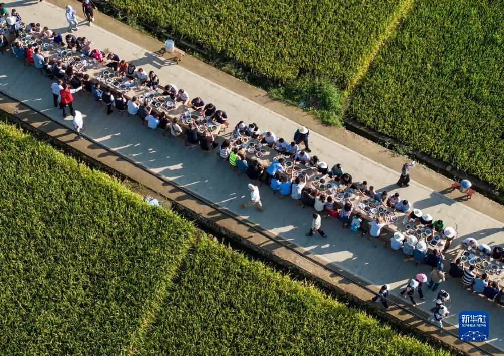 9月2日,在鹽邊縣惠民鎮(zhèn)興隆村的稻田邊,人們?cè)谪S收長(zhǎng)桌宴上享用當(dāng)?shù)貍鹘y(tǒng)美食(無(wú)人機(jī)照片)。