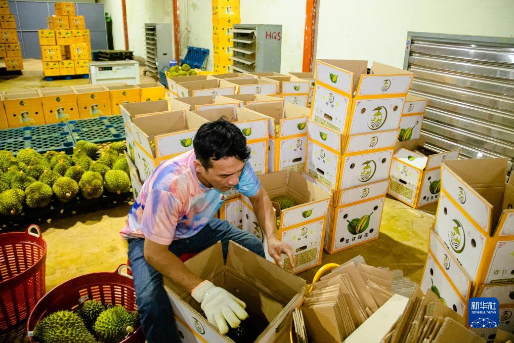 9月15日,在越南多樂省一家榴蓮加工廠,一名工人在打包榴蓮。