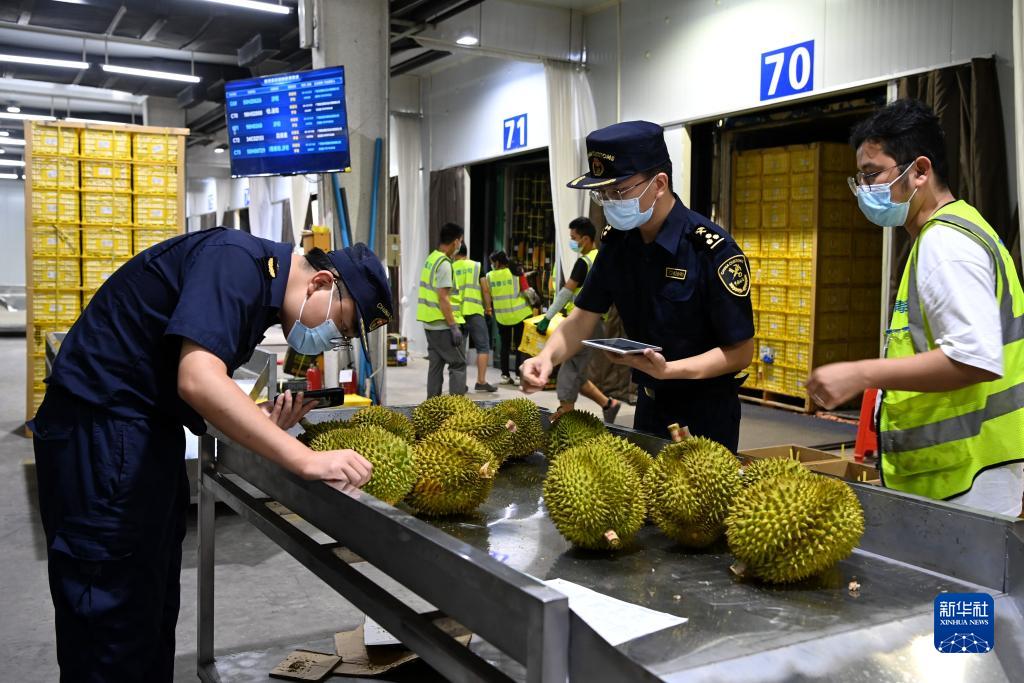 9月12日,在廣西憑祥友誼關(guān)口岸,海關(guān)工作人員對進口的榴蓮進行查驗。