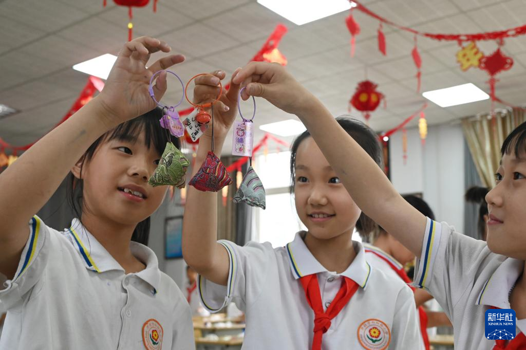 6月5日,河南省開封市向陽路小學(xué)的學(xué)生展示自己制作的香囊。