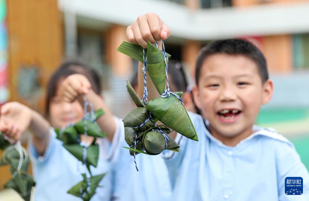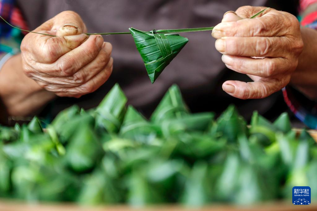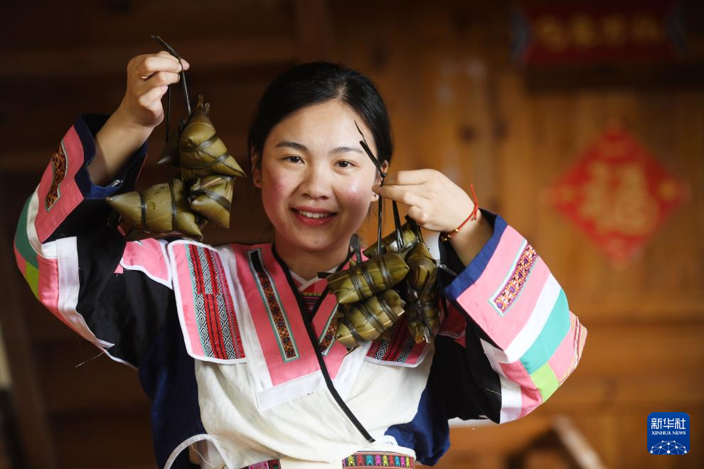 6月5日,廣西桂林市龍勝各族自治縣三門鎮(zhèn)安康村的村民展示剛包好的粽子。