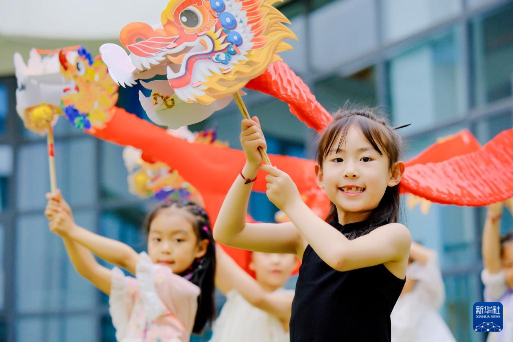 6月5日,河南省濟源市第一幼兒園的小朋友在體驗舞龍。