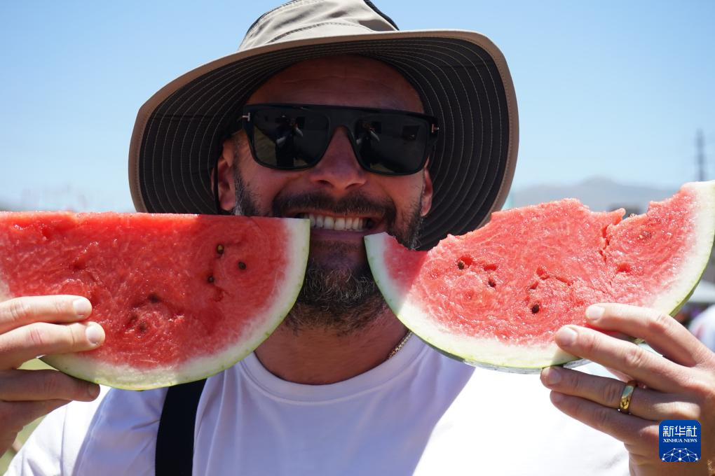 6月22日,一名男子在美國加利福尼亞州洛杉磯舉行的加州西瓜節(jié)上留影。