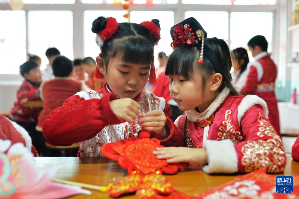 1月14日,在山東青島北仲路第二小學(xué)開展的“國(guó)風(fēng)古韻”迎新春主題活動(dòng)上,兩名學(xué)生在給中國(guó)結(jié)固定線繩。