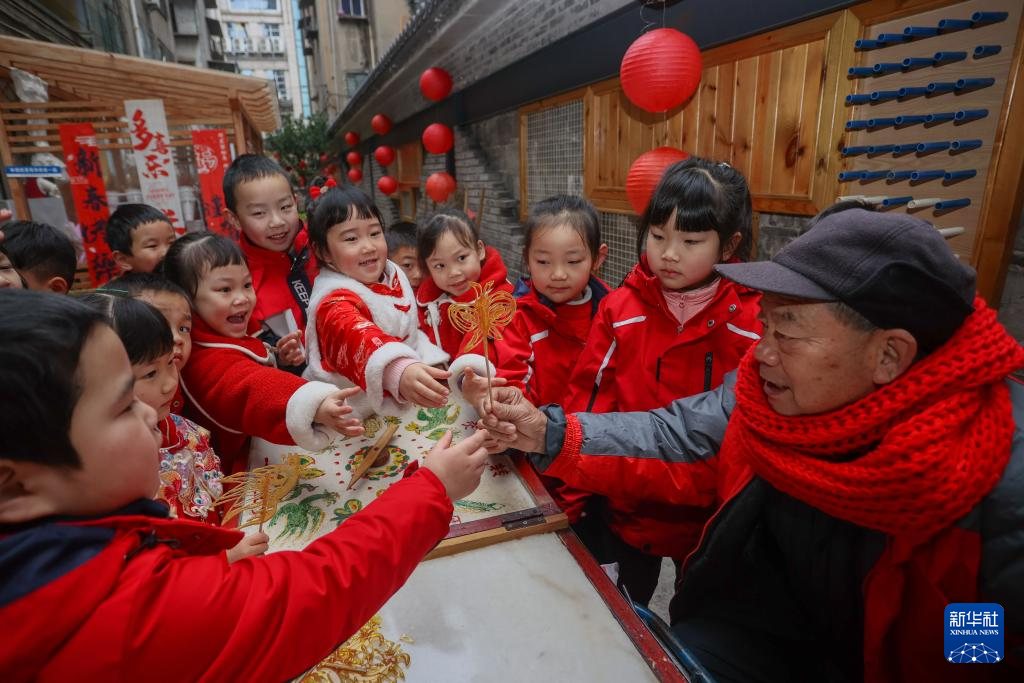 1月13日,在四川省遂寧市船山區(qū)順城街幼兒園舉辦的新春廟會(huì)上,孩子們圍觀糖畫制作。