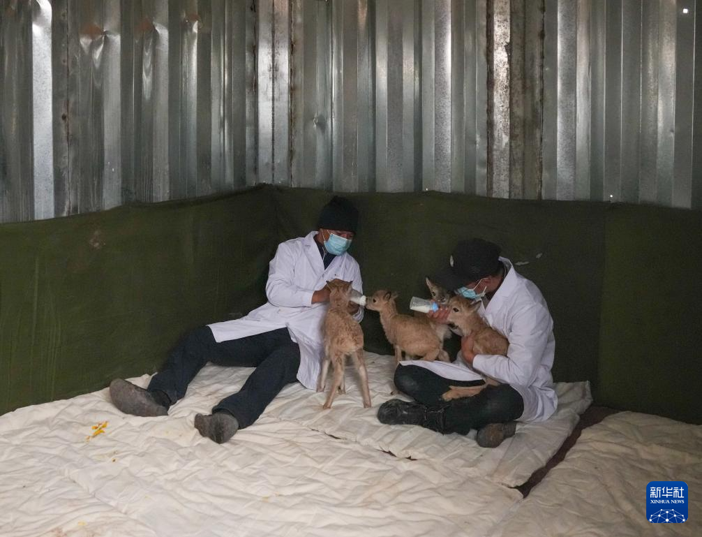 巡山隊(duì)員在可可西里卓乃湖保護(hù)站給救助的小藏羚羊喂奶(7月2日攝)。