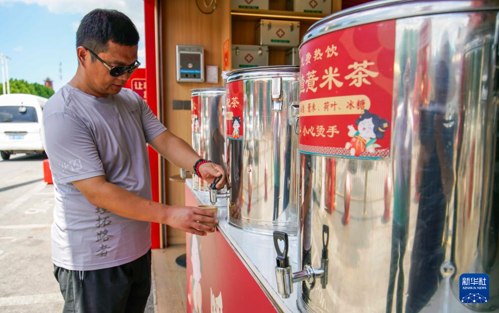 7月13日,游客在河北省豐南區(qū)河頭老街景區(qū)暖心驛站享受免費飲品。