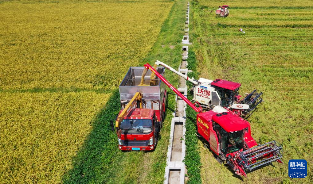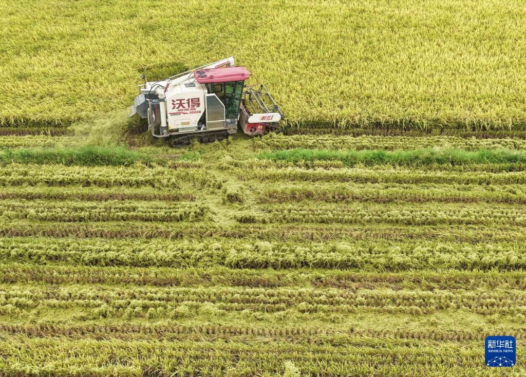 8月7日,在湖南省永州市道縣壽雁鎮(zhèn)社下村,農(nóng)民駕駛農(nóng)機(jī)收割水稻(無(wú)人機(jī)照片)。