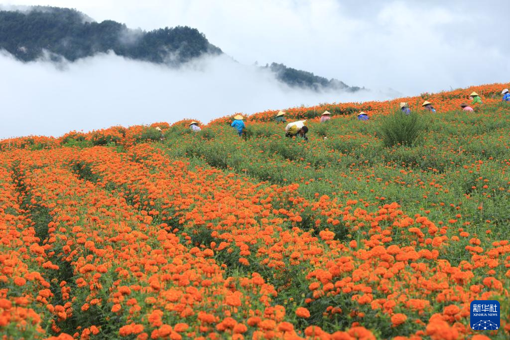 8月7日,在云南騰沖市固?hào)|鎮(zhèn),農(nóng)民采收萬(wàn)壽菊。