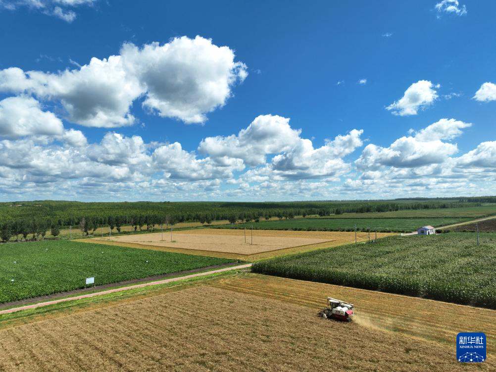 8月7日,在黑龍江省農(nóng)墾科學(xué)院九三科創(chuàng)中心,一臺(tái)收割機(jī)在小麥繁殖田進(jìn)行收獲作業(yè)(無(wú)人機(jī)照片)。