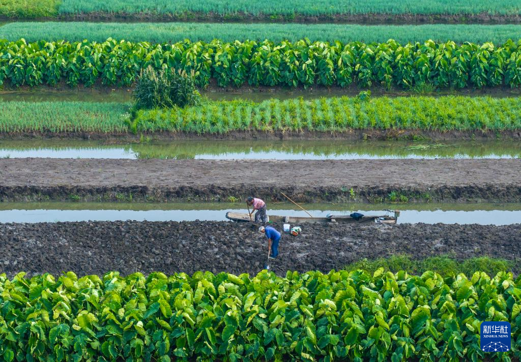 8月7日,農(nóng)民在江蘇省興化市垛田街道高家蕩村的田間勞作(無(wú)人機(jī)照片)。