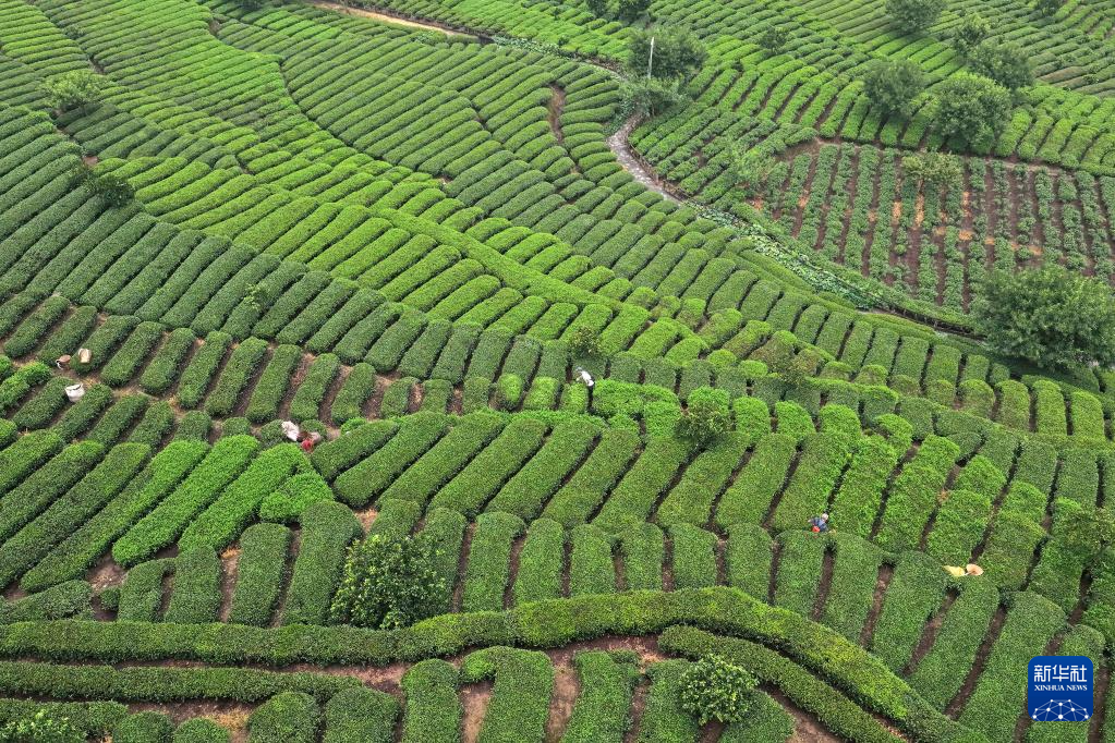 8月7日,茶農(nóng)在三峽庫(kù)區(qū)湖北省宜昌市秭歸縣茅坪鎮(zhèn)松樹(shù)坳村一茶園采摘秋茶(無(wú)人機(jī)照片)。