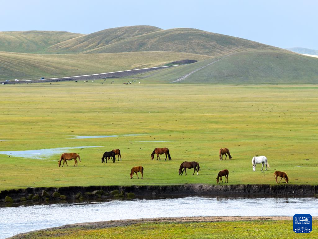9月14日在內(nèi)蒙古呼倫貝爾市陳巴爾虎草原拍攝的馬群(無(wú)人機(jī)照片)。
