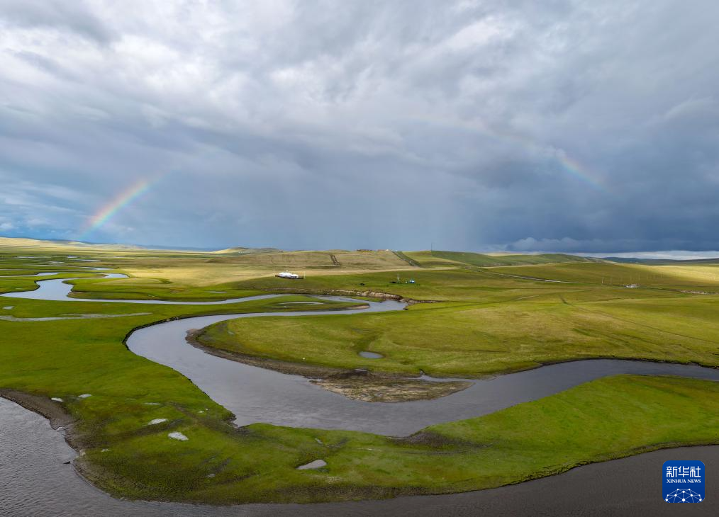 9月14日在內(nèi)蒙古呼倫貝爾市陳巴爾虎旗拍攝的彩虹下的莫爾格勒河(無(wú)人機(jī)照片)。